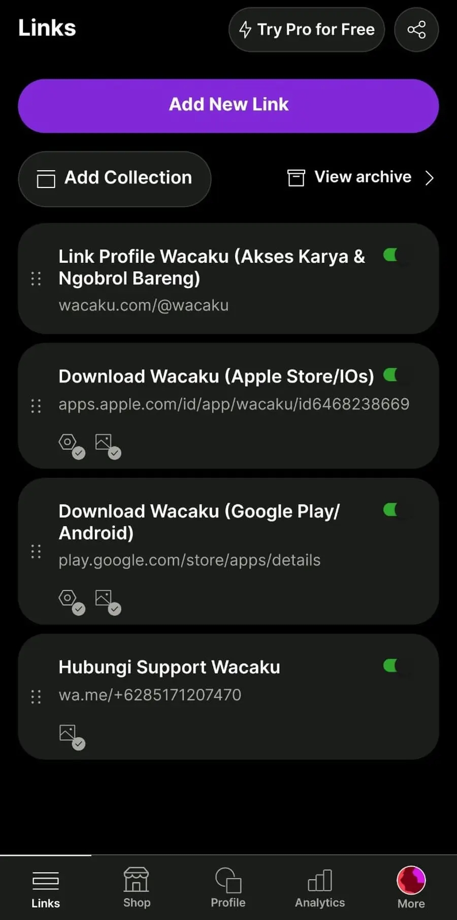 I. Kenapa Sih Perlu Link Terpusat? Kalau kamu aktif di Wacaku, pastinya pengen dong pembaca bisa gampang nemuin semua karya, informasi, dan dukungan yang mereka butuhkan dalam satu kali klik? Dengan punya satu link terpusat (seperti Linktree), kamu bisa bikin pembaca lebih gampang: mereka cukup klik satu link untuk menemukan semua tautan penting, mulai dari profil Wacaku, link download aplikasi, grup diskusi, sampai link support Wacaku kalau ada komplain atau kebingungan!